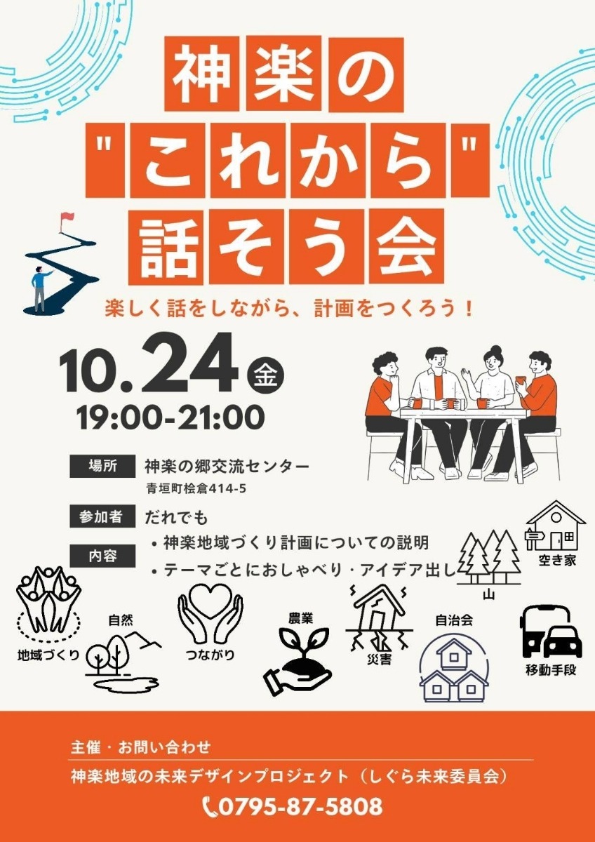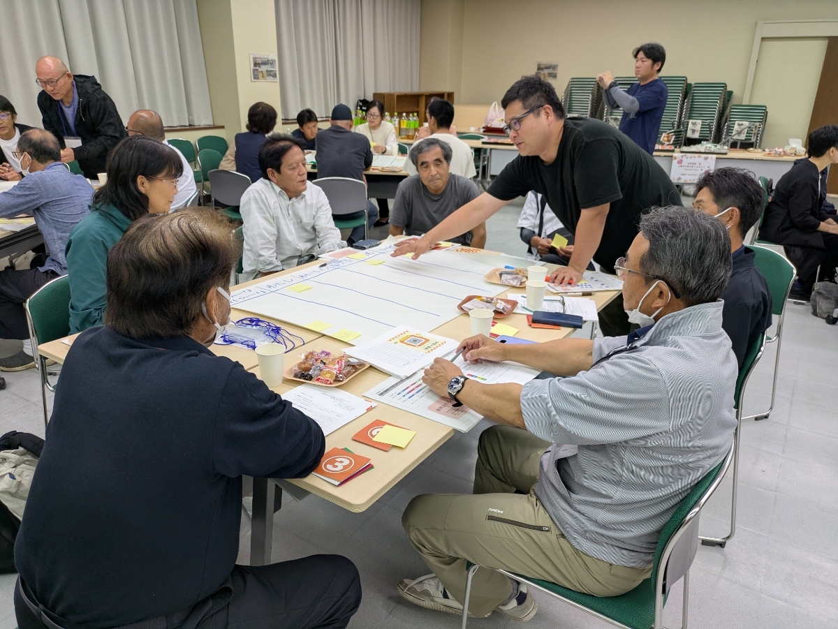 また、神楽地域の未来デザインプロジェクトによる「神楽の“これから”話そう会」(10月24日開催/しぐら未来委員会)では、まちづくり計画に住民の声を反映するため、委員以外の地域住民も参加。「自治会・組織」「災害・つながり」「自然・農業」の3テーマに分かれて議論し、模造紙にまとめて発表しました。事前に委員が地域の声を直接聞いてきたこともあり、多様な視点が交わる充実した時間となりました。