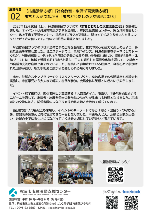 2025年12月20日(土)、丹波市市民プラザにて「まちとわたしの大交流会2025」を開催しました。本イベントは丹波市市民プラザが主催し、市民活動支援センター、男女共同参画センター、氷上子育て学習センター、託児室Tプラスが連携し、関わってくださる皆さんと共につくり上げてきた催しです。今年で6回目の開催となりました。