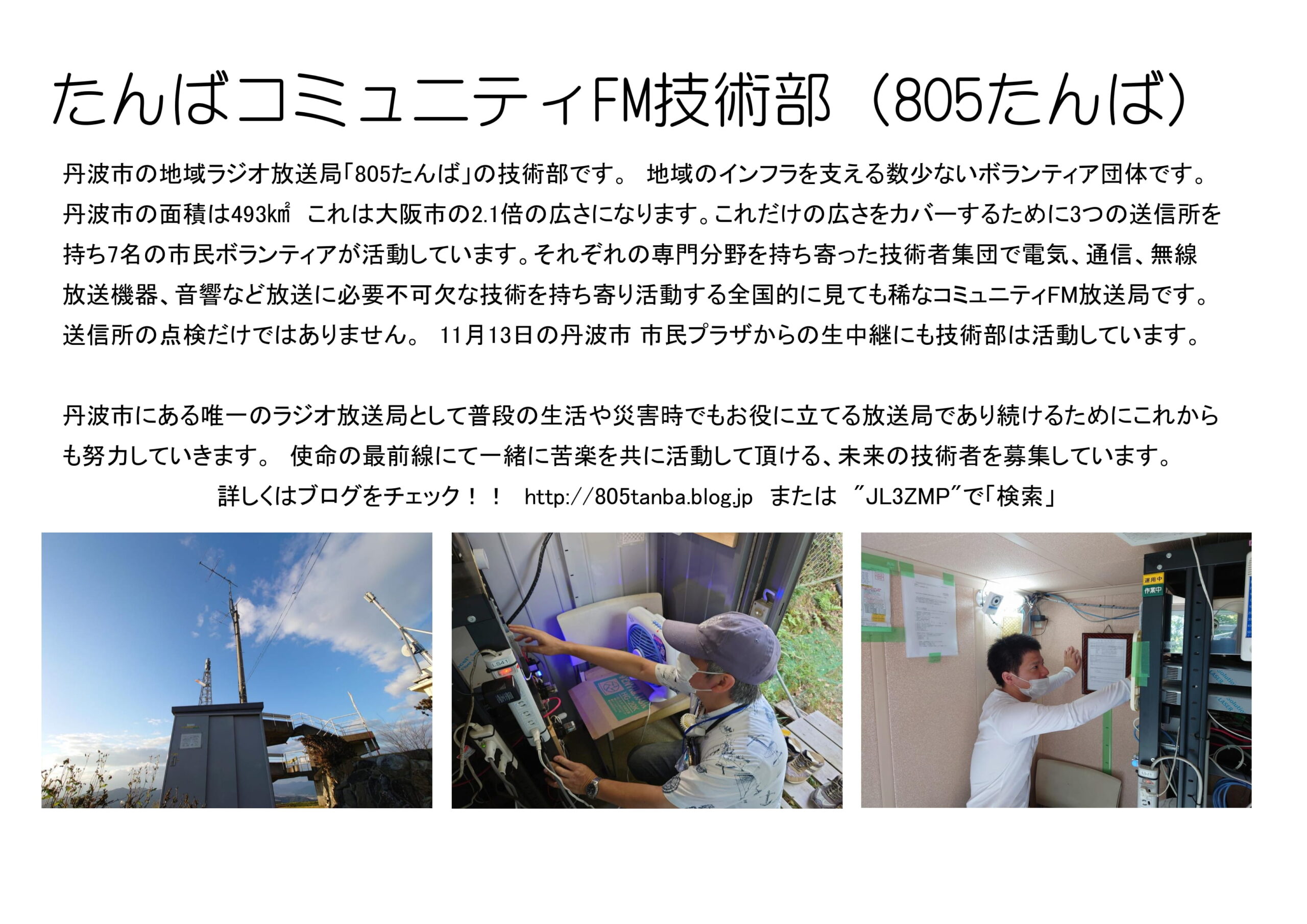 知る!出会う!つながる!まちとわたしの大交流会2021 > お知らせ > 【参加団体PR④】たんばコミュニティFM技術部 【参加団体PR④】たんばコミュニティFM技術部 2021年11月6日 お知らせ 出展・出演団体情報 参加種別:展示ブース 団体名 :たんばコミュニティFM技術部 内容紹介:丹波市のラジオ放送局「805たんば」の技術部です。ラジオ放送というインフラを支えながら地域に貢献します。