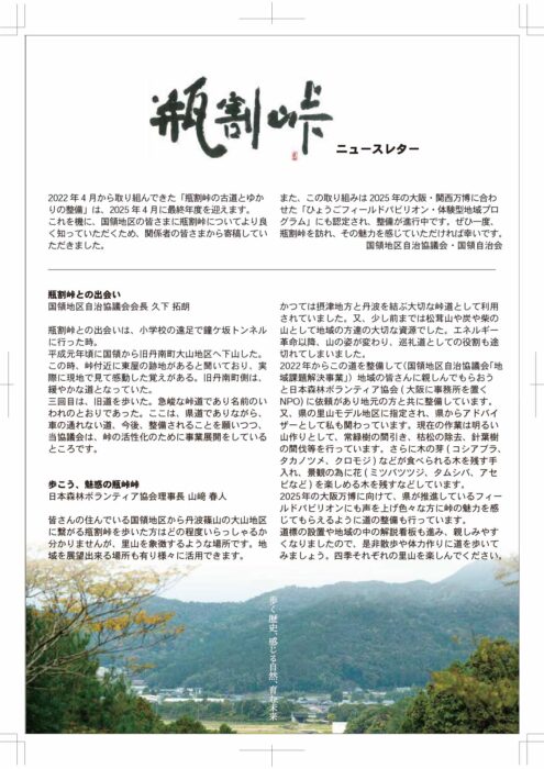 丹波市国領と丹波篠山市大山を徒歩で繋ぐ瓶割峠は、江戸時代から巡礼道として使われてきた風情のある道です。鉄道やトンネルができて、すこしずつ忘れられていきそうな瓶割峠の歴史的な価値や静謐な美しさを紹介し、地域の活性化に貢献することが亀割峠プロジェクトのミッションです。