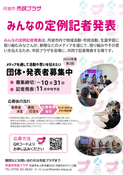 丹波市内で地域活動・市民活動、生涯学習に取り組むみなさんが、新聞などのメディアを通じて、取り組んでいることやその思いを伝えるため、市民プラザを会場に、共同で記者発表する場です。