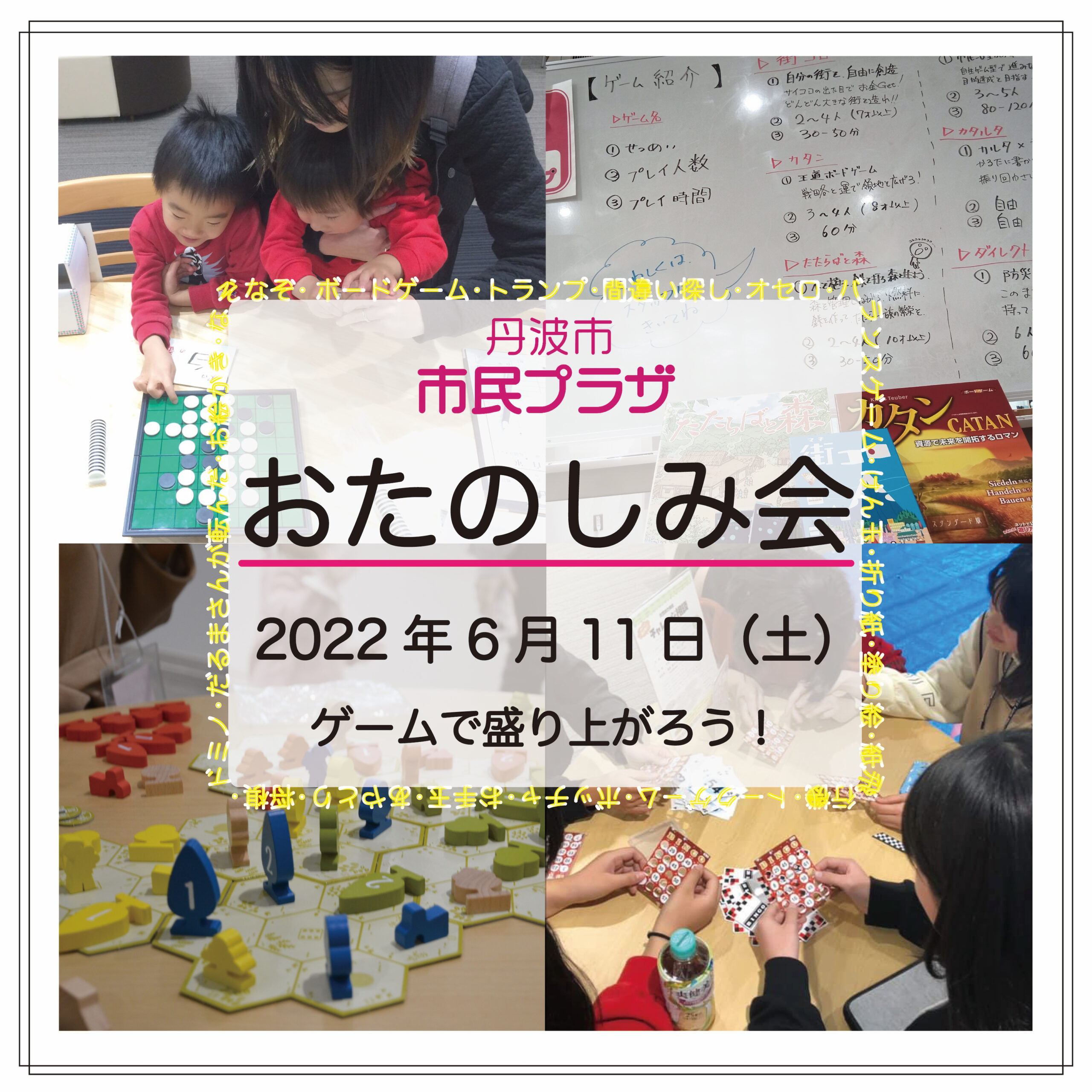 ボードゲーム(カタン、街コロ、たたらばと森)、カードゲーム(トランプ、ウノ、カタルタ)、折り紙、けん玉、間違い探し、お絵かき、だるまさんが転んだ など