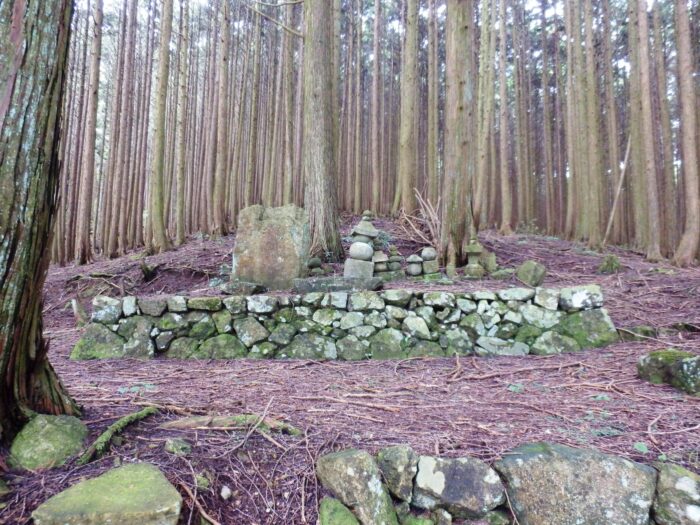 足立一党没落す。後彦助を山垣殿という。城山の根に遠政の塚二尺五寸ばかりの五輪あり。谷川の西田の中に彦助夫婦の塚あ