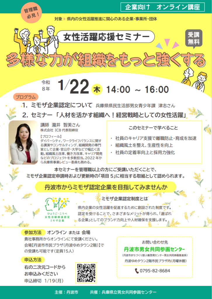 - 参加方法 オンラインまたは会場 貴社事務所からオンラインにて受講ください。会場(丹波市市民プラザ)での受講も可能です。(定員15人)
